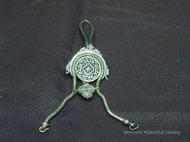 Metal watch fox with a central filigree disk. It has a chain looped around the disk with clasps at either end.