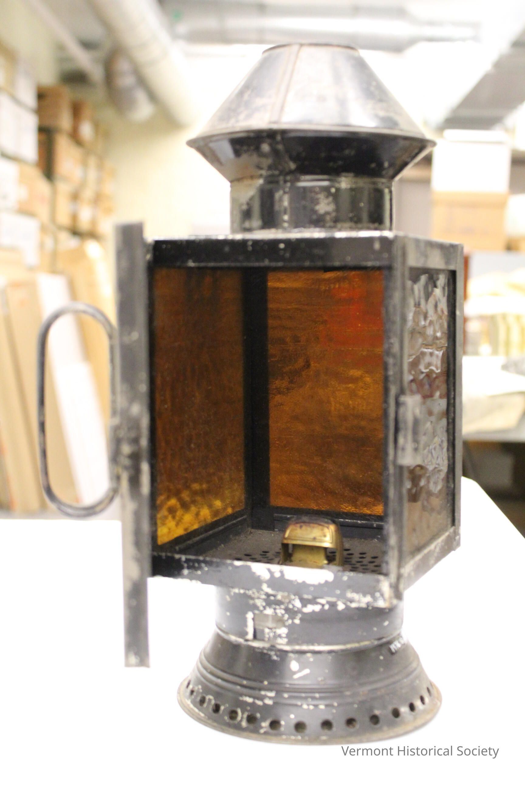 Metal kerosene lantern, painted black with darkened brown glass sides. The lantern is rectangular in shape with a cone-like projection at the top and a rounded base with holes. There is a handle on one side in the middle of the device; this side opens (from a hinge) to reveal a space for a kerosene flame on the inside. Maker's mark printed on one of the outer sides of the object "[illegible] NEW YORK."