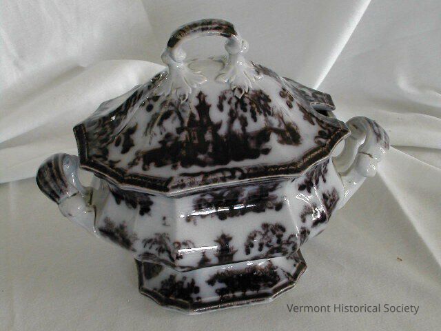 Covered sauceboat transfer-printed in the Mulberry pattern. The pattern features pagodas and trees.