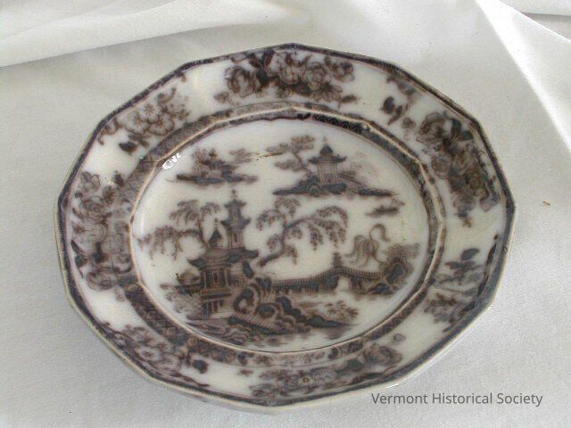 Transfer-printed dessert plate with a design of pagodas, bridges and tress. The design is printed in black.