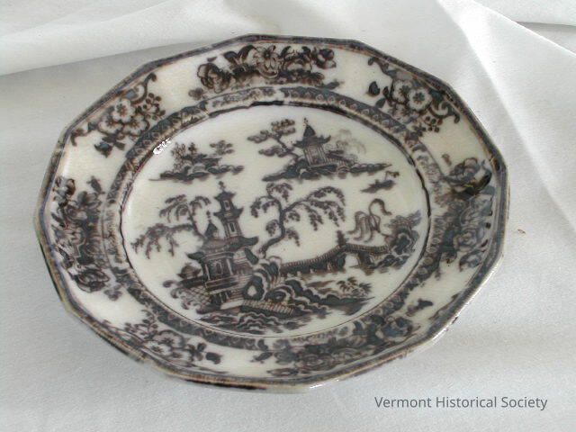 Transfer-printed dessert plate with a design of pagodas, bridges and tress. The design is printed in black.