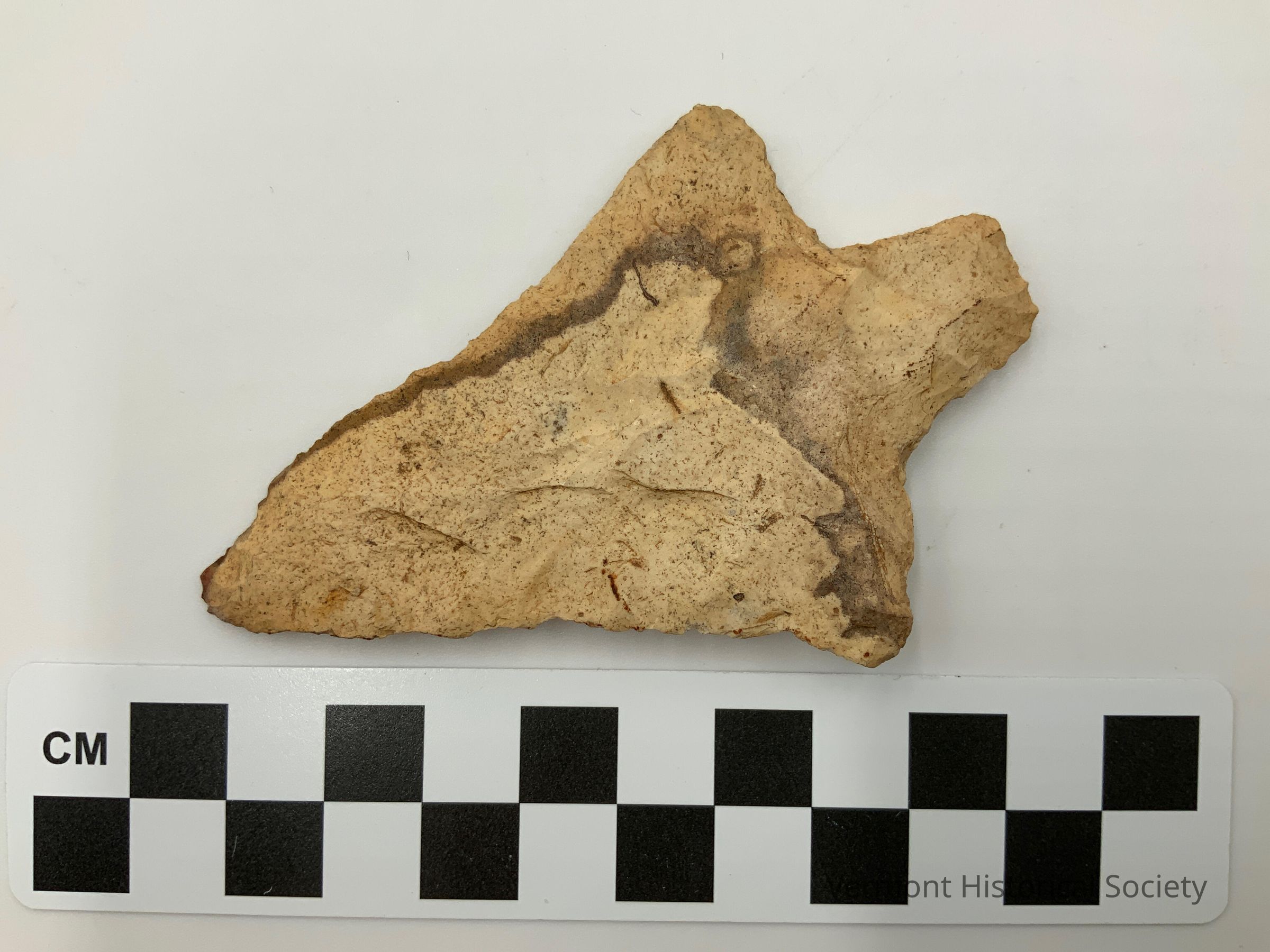 Tan colored chipped stone projectile point with a contracting stem. The blade edges curve inward.