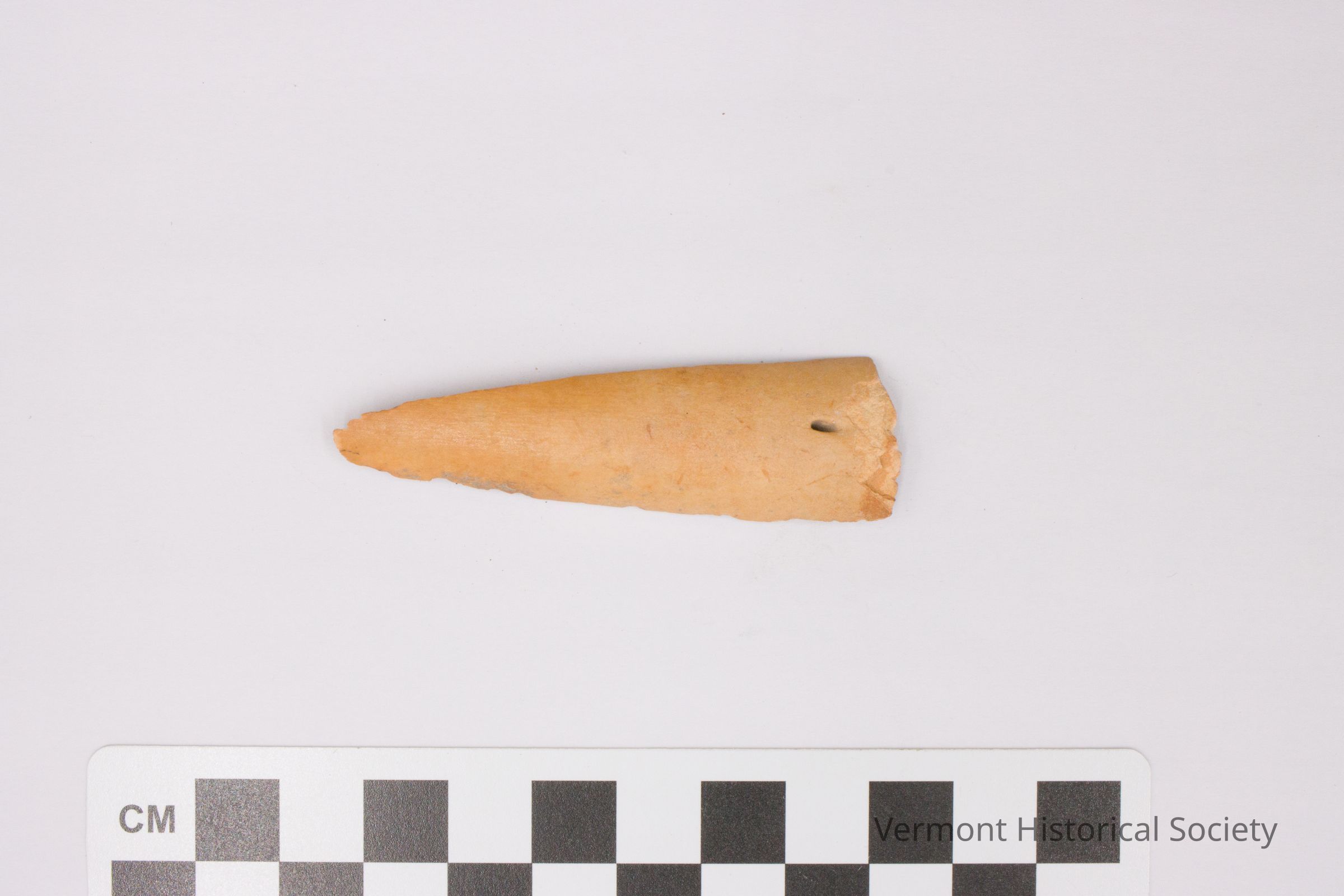 Worked animal bone. The bone is shaped into a point with a hole drilled through the wide end.