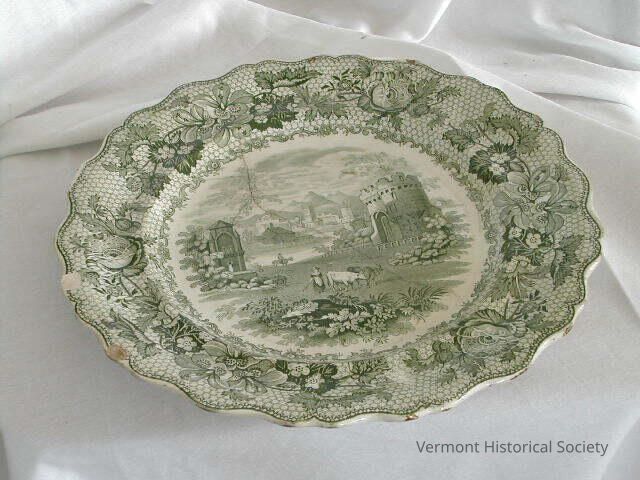Green-and-white transfer-printed plate with a central scene of a person and two cows in a pastoral landscape dotted with castle ruins. The border is printed with large flowers over a honeycomb pattern.