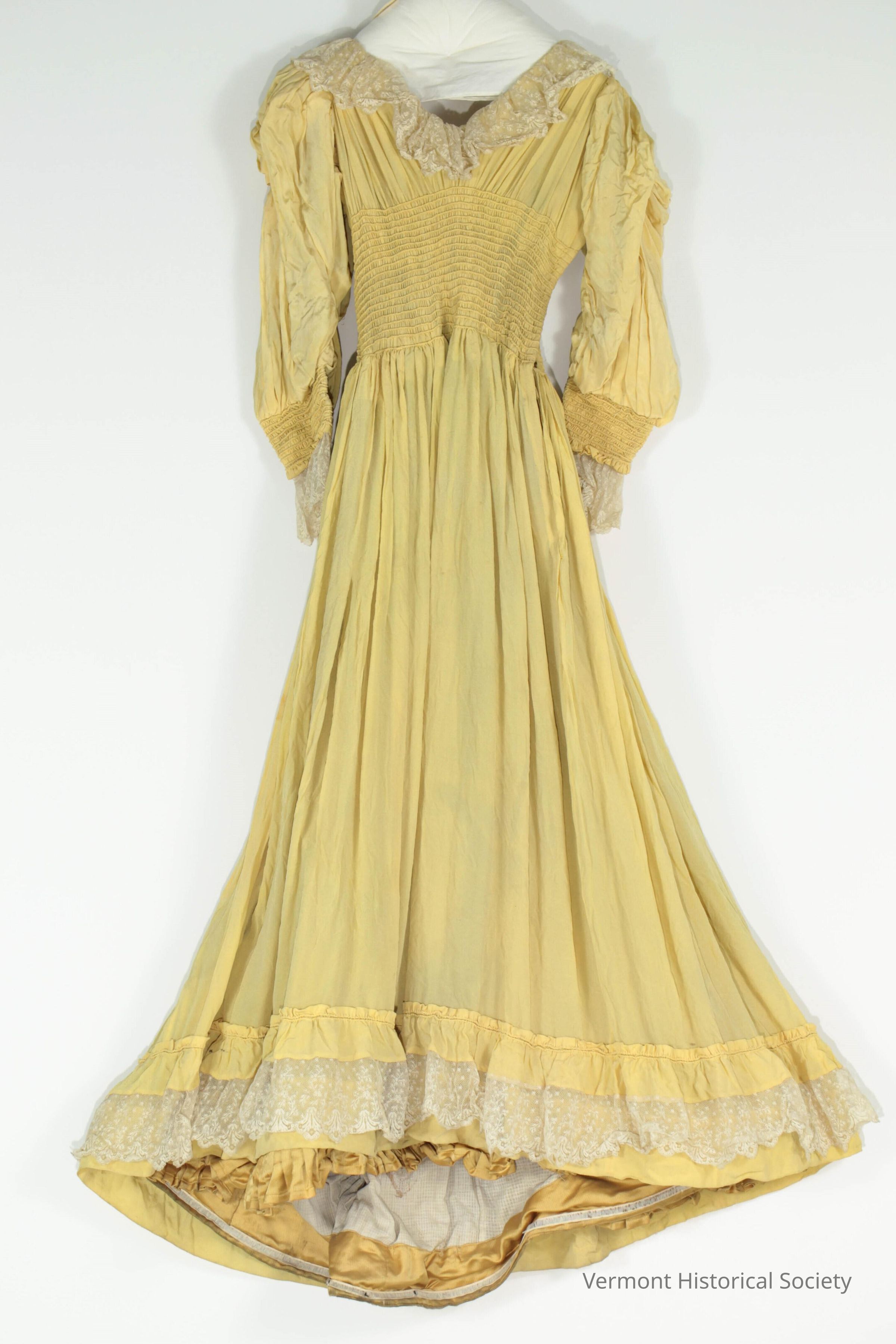 One pieces yellow silk ball gown with fitted bodice, trimmed with ivory lace at the neckline, cuffs and hemline. There is yellow ribbon trim at the back of the bodice that extends down the length of the skirt. The bodice is fitted to the wearer with 20 rows of corded gathers around the torso. The same gathers are at the sleeve cuffs, and the tops of the sleeves are gathered vertically. The hem of the skirt is held out with boning. The dress opens at the side, securing with hooks and eyes.Context