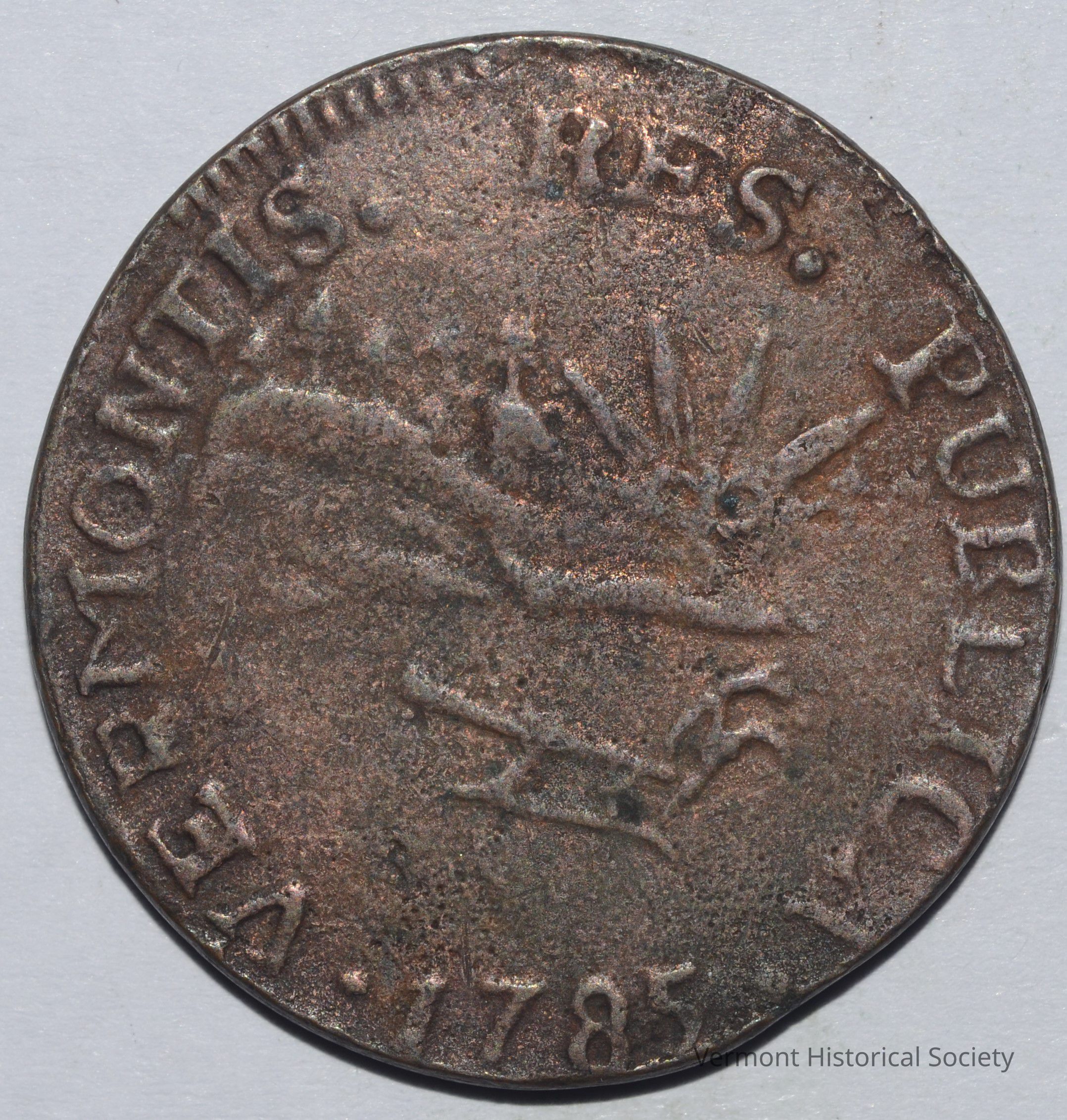 Cast and electrotype copy of a Vermont copper. It has a radiating eye on one side and a pictorial scene on the other. The eye side shows a detailed human eye with 13 rays emitting from it in every direction. Between each ray is a 6-petaled flower (13 in total). The words, "STELLA QUARTA DECIMA" ring the edge. The reverse shows a scene of a plow in a field with a line of hills and trees on the horizon. A sun with two eyes and a prominent nose peeks over the horizon. The words "VERMONTS RES PUBLICA" ring the edge.