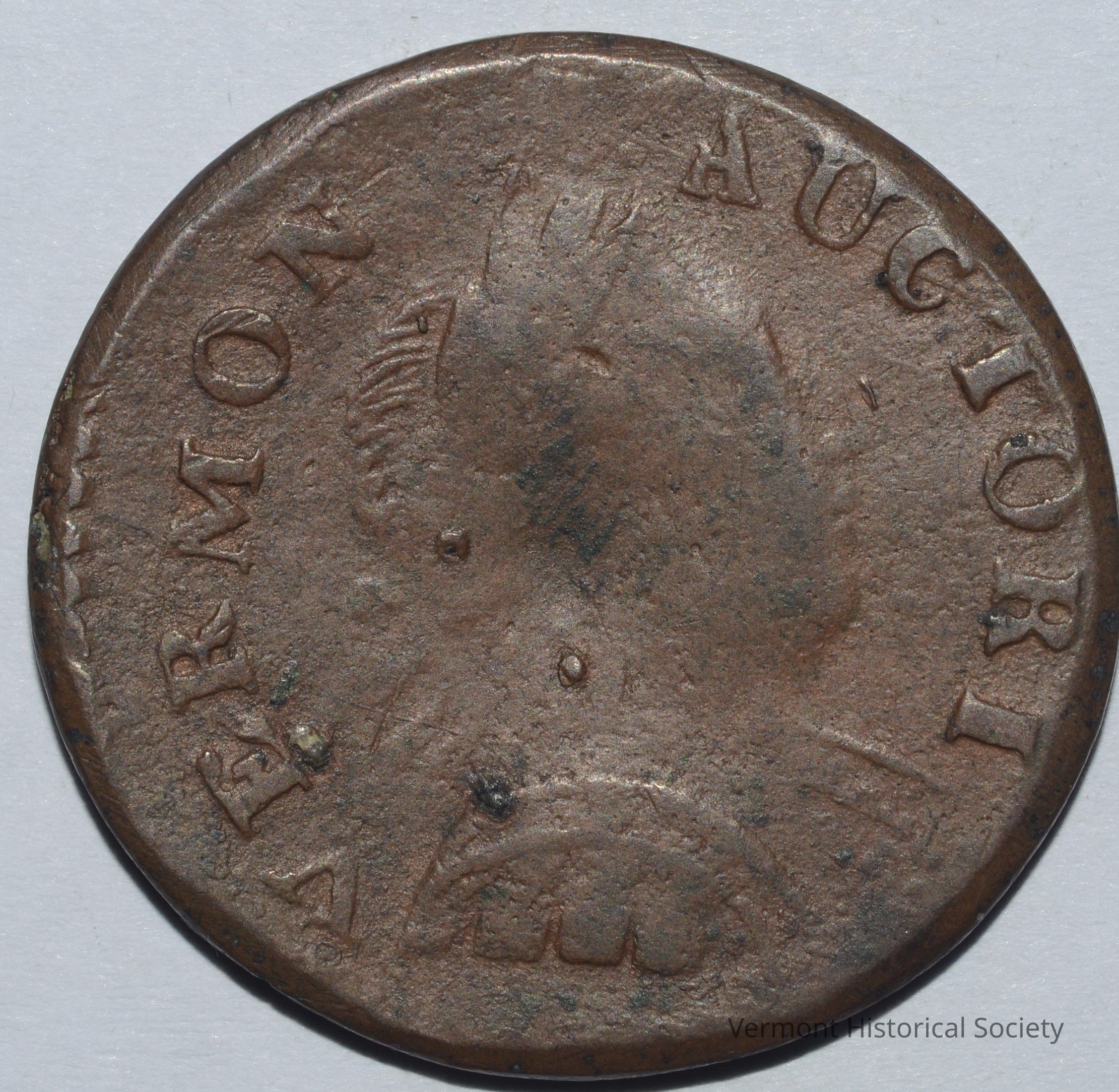 Cast and electrotype copy of a Vermont copper. It has a bust on one side and the allegorical figure, Columbia, on the other. The face side shows a right-facing bust of a Roman figure, wearing a laurel wreath on his head, tied with a ribbon at the nape of his neck, and military armor. The words "GEORGIVS III REX" ring the edge. On the reverse, Columbia is shown swathed in loose fabric, seated next to a shield bearing the Union flag. She is holding a staff with a liberty cap in her left hand, and a small branch in her right hand. The words, "INDE ET LIB" ring the edge.Acquisition