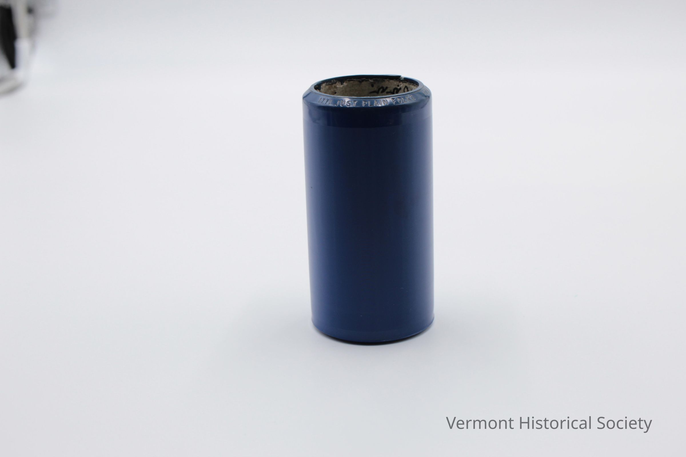 Blue phonograph cylinder with a cardboard case. The cylinder, or "record", is a hollow cylinder consisting of hard, blue, ridged celluloid around a concrete core. One edge of the cylinder is labeled in white with the words, "1771 JUST PLAIN FOLKS ADA JONES AND CHO / Thomas A Edison PAT'D. 24 3321".Use