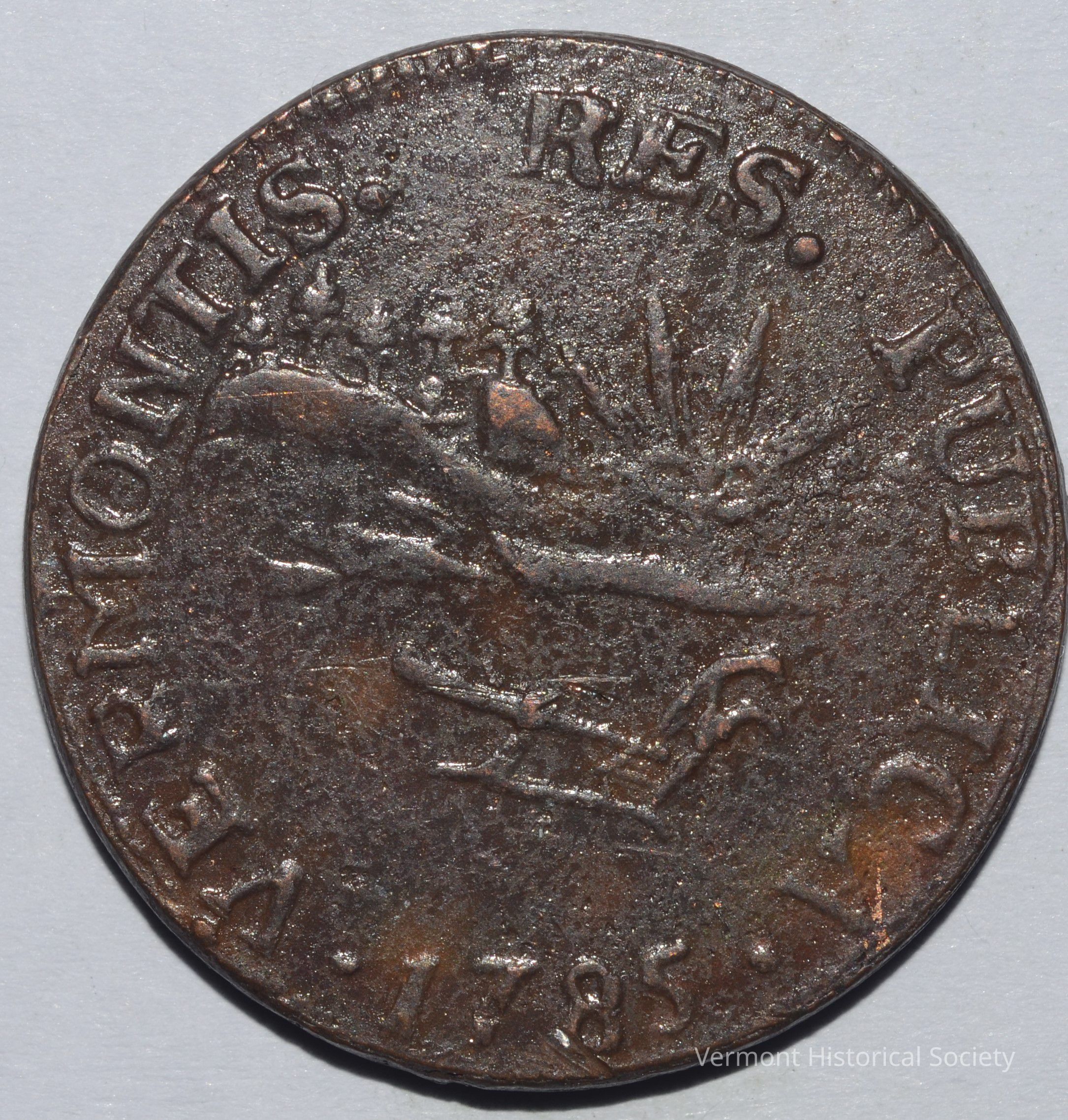 Cast and electrotype copy of a Vermont copper. It has a radiating eye on one side and a pictorial scene on the other. The eye side shows a detailed human eye with 13 rays emitting from it in every direction. Between each ray is a 6-petaled flower (13 in total). The words, "STELLA QUARTA DECIMA" ring the edge. The reverse shows a scene of a plow in a field with a line of hills and trees on the horizon. A sun with two eyes and a prominent nose peeks over the horizon. The words "VERMONTIS RES PUBLICA 1785" ring the edge.