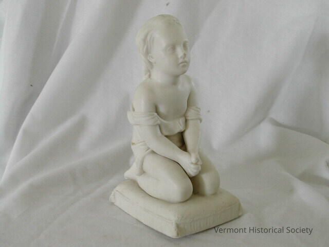 Unglazed white ceramic figure showing a child kneeling on a pillow. The child is shown wearing a chemise that has fallen off the shoulders and sits bunched above the child's waist. The hands are clasped between the child's thighs. The bottom is marked "171" in pencil.