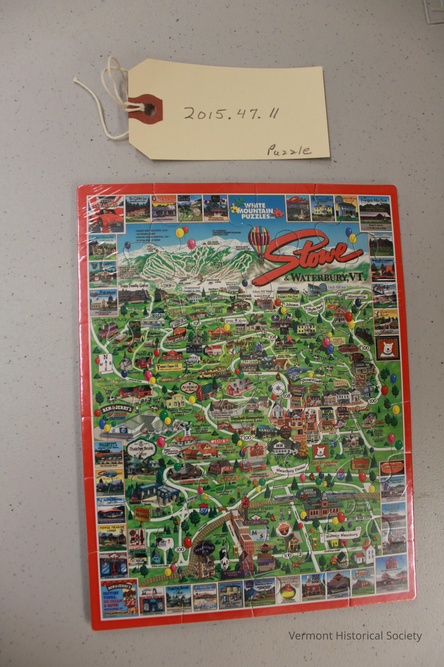 Postcard-sized puzzle showing a stylized bird's-eye map of Stowe and Waterbury, Vermont. The back is printed with mailing instructions, telling the purchaser to write a message on the back of the puzzle, "take the puzzle apart and put the puzzle pieces in the envelope provided." The puzzle is shrink wrapped with clear plastic and has not been used.Acquisition