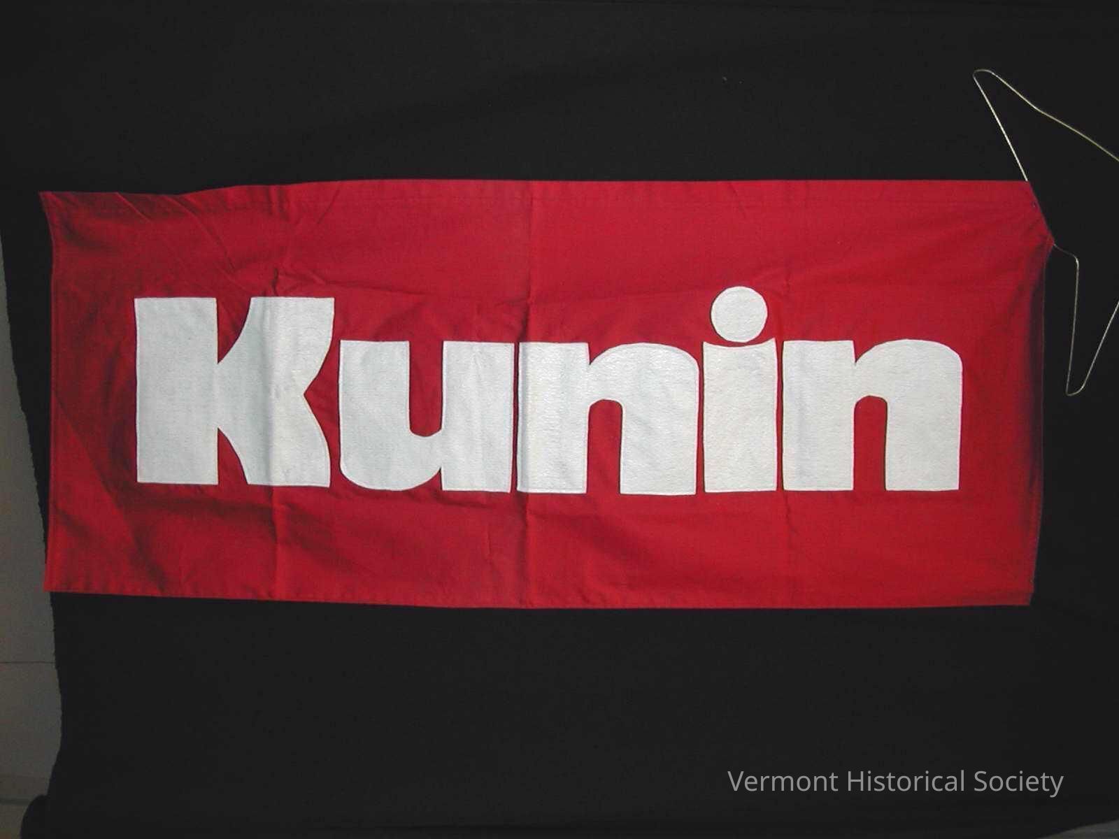 Rectangular maroon banner with the word "Kunin" appliqued to one side in white felt.