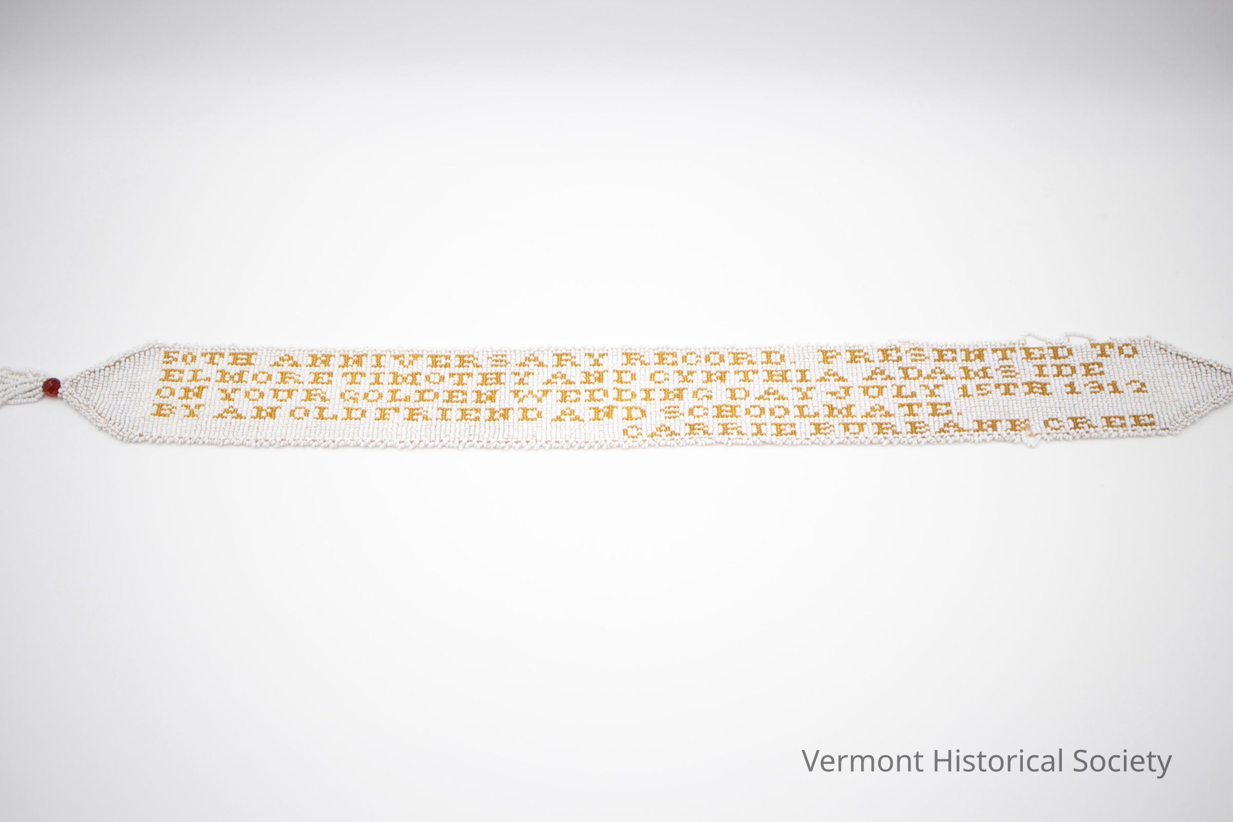 Small banner woven of glass seed beads with the inscription, "50TH ANNIVERSARY RECORDS. PRESENTED TO ELMORE TIMOTHY AND CYNTHIA ADAMS IDE ON YOUR GOLDEN WEDDING DAY JULY 15TH 1912 BY AN OLD FRIEND AND SCHOOLMATE, CARRIE BURBANE CREE". The ends taper to points and end in tassels secured by a large, red glass bead.Context