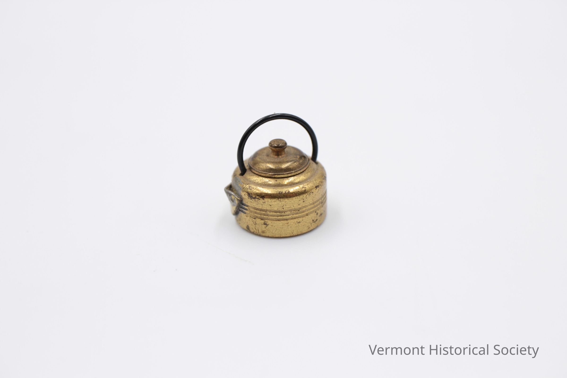 Miniature brass tea kettle with removable lid. There is a round wire handle spanning the top.Context