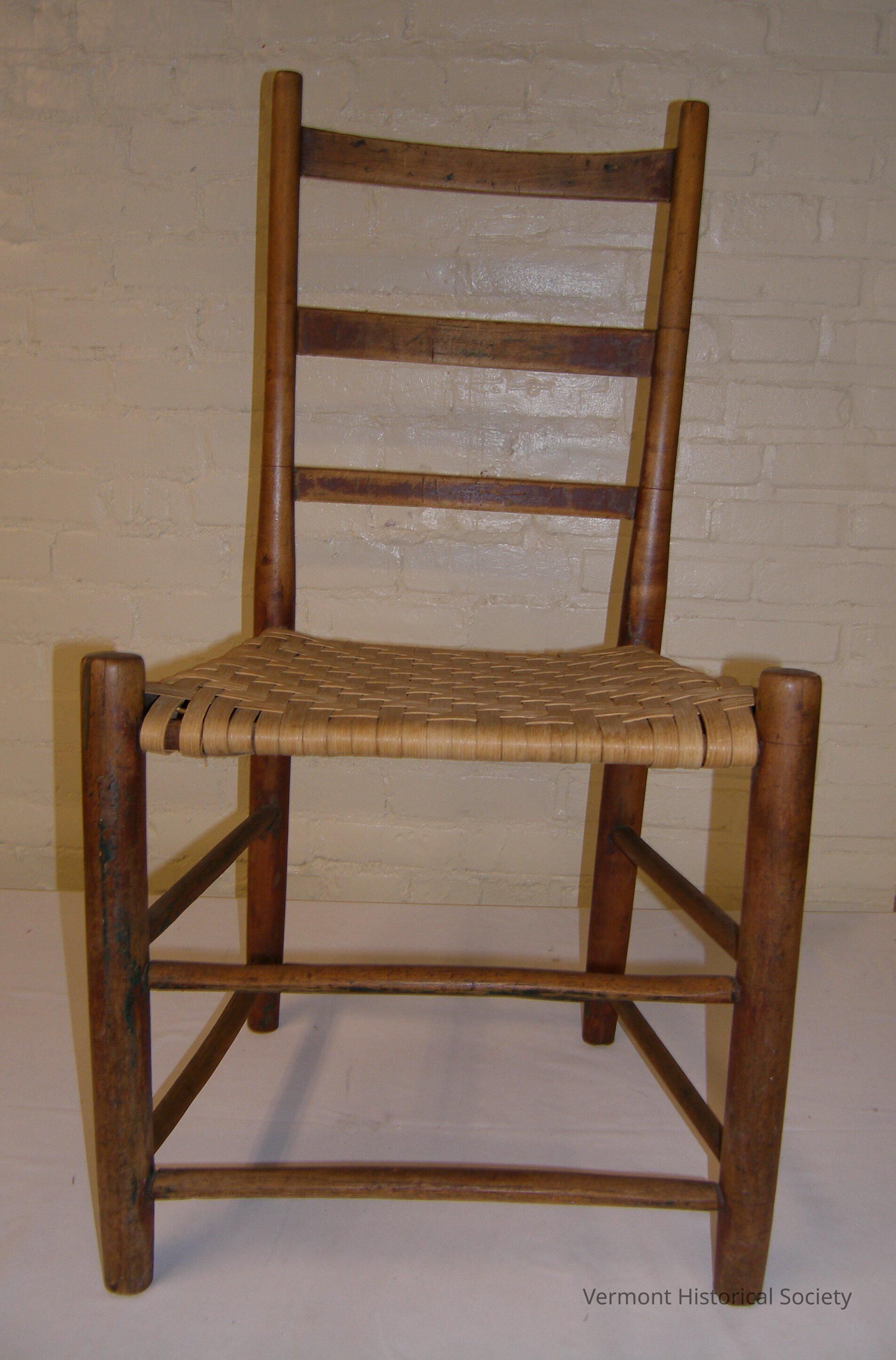 This is a ladder back chair that was crafted with a reed seat. It features three slats on the back, as well as two rungs on both the front and sides of the chair. The back of the chair only has one rung, which was likely intentional as part of its design. Upon close inspection, it is evident that the wood on the chair shows traces of red and green paint. The backs of the slats are gouged, while the bottom slat appears to be severely cracked. The reed seat of the chair is wider towards the front than it is towards the back, and it seems to have been replaced at some point in the past.Context