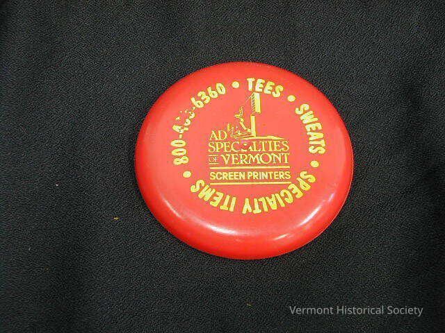 Miniature red vinyl flying disk. The top is printed in yellow with the words, "800-4[illeg]-6360 . TEES . SWEATS . SPECIALTY ITEMS" around the edge and "AD SPECIALTIES OF VERMONT / SCREEN PRINTERS" in the center.