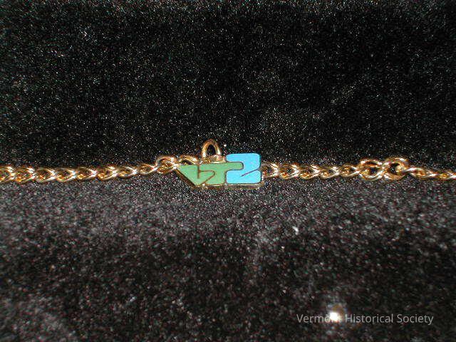 Bracelet consisting of a gold-toned metal chain and an enameled charm. The charm is in the shape of Vermont's logo for the US Bicentennial ("VT2") in blue and green.