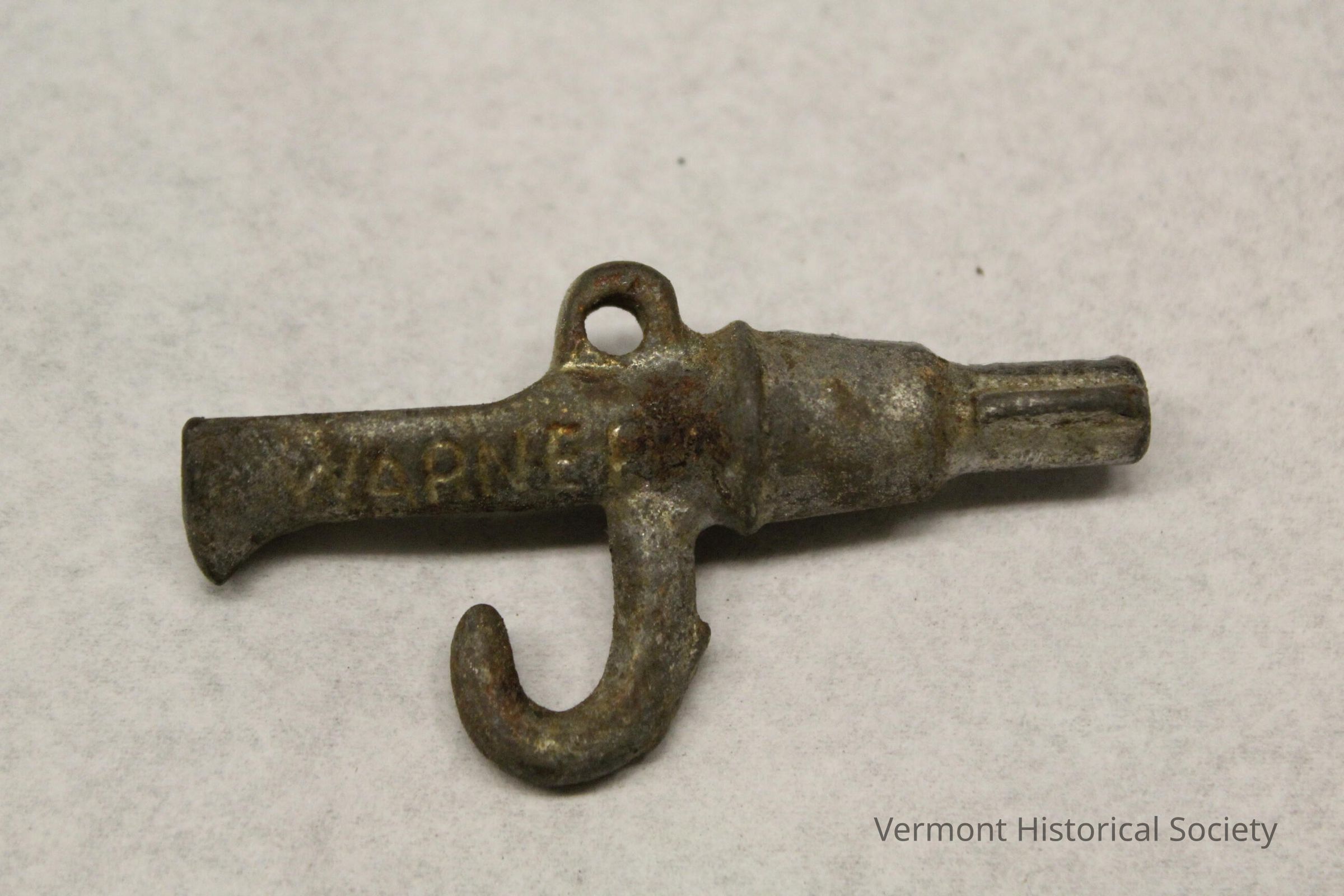 Sap spout with small curved hook on bottom, meant for holding sap collecting/gathering bucket. Made of metal; stamped "WARNER" on one side and "PAT-D" on the other. Silver, slightly rusted from usage.