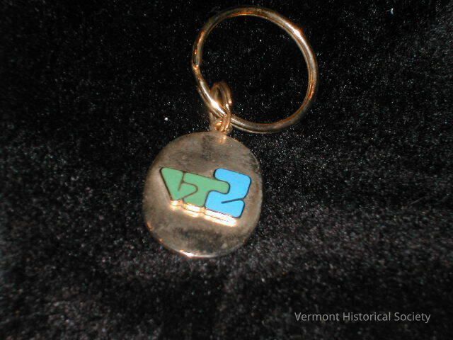 Metal key ring consisting of a ring and a medallion. The medallion is oval with a raised, enameled logo consisting of the letters VT in green and the number 2 in blue.