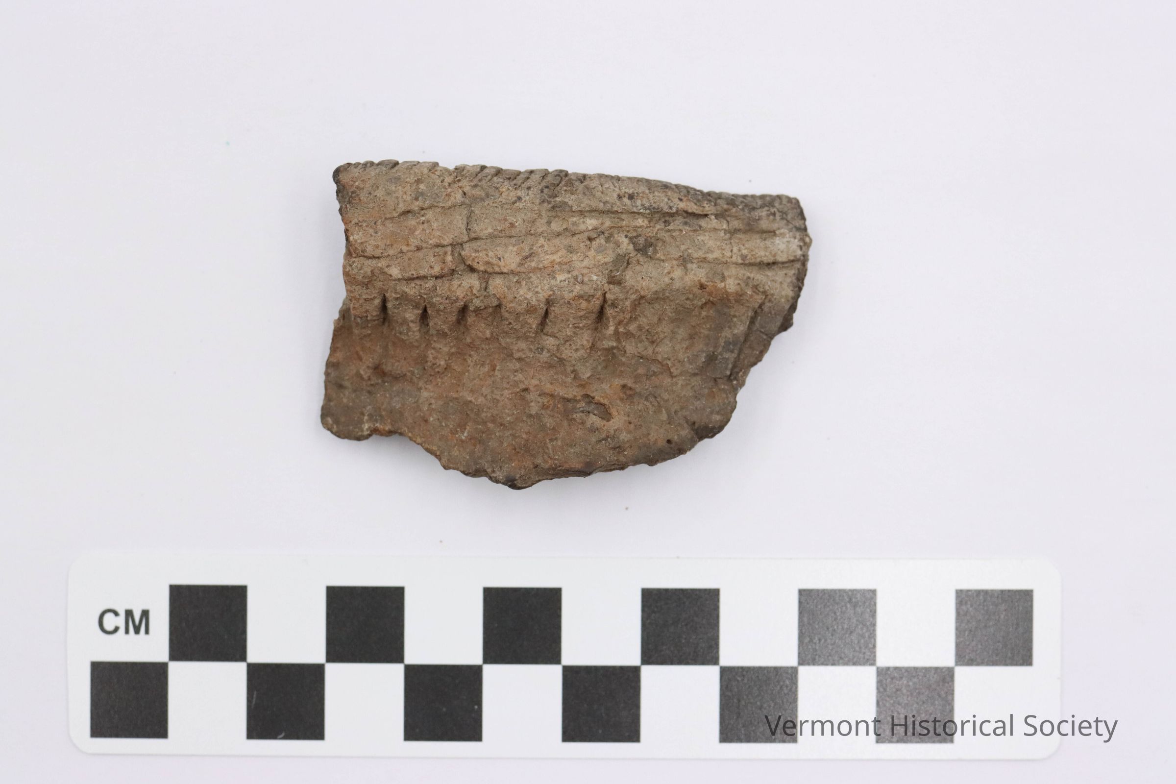 Pottery rim sherd decorated with three rows of horizontal incised lines followed by a row of vertical incised lines. There are oblique incised lines on the lip.