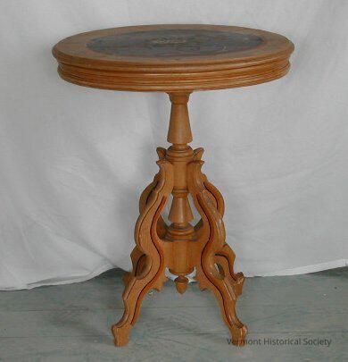 Oval side table; one central post divides into four curved and decorated legs. Country cottage style with grain painting to resemble zebra maple. Top has an oval grained section like burl walnut with a painted flower in the center.