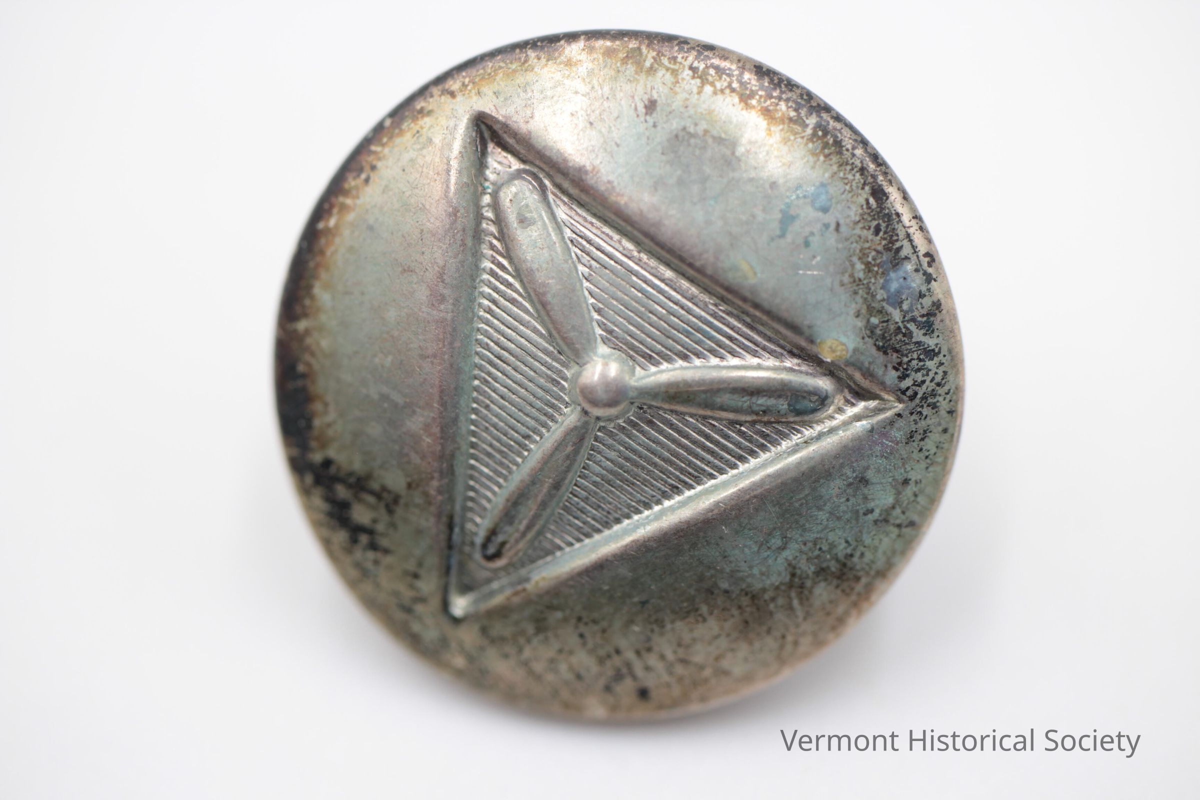 Silver-colored, metal button featuring the symbol of the Civil Air Patrol -- a triangle with a propeller in the middle.