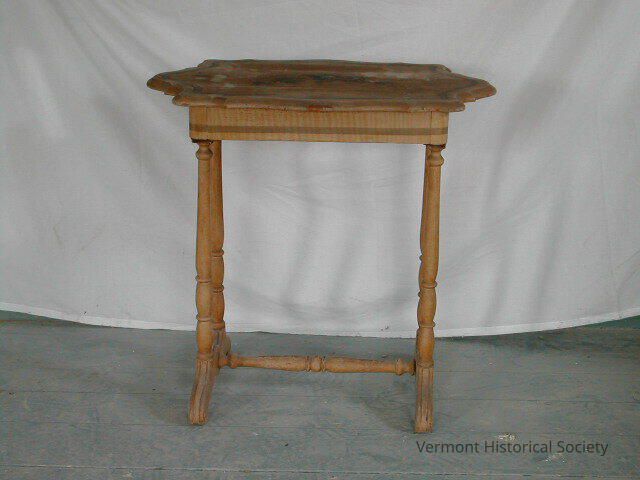 Small wooden side table with a lobed top. It is grain painted in imitation of zebra maple with a stenciled floral design in the center. It sits on turned legs that are connected at the bottom. There is one drawer.