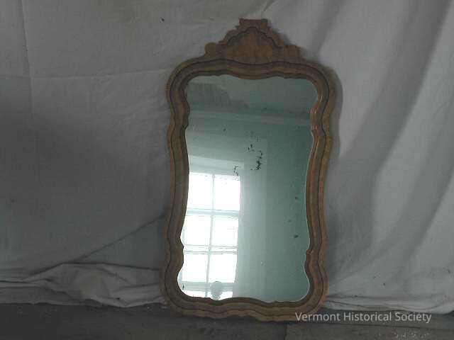 Rectangular mirror with scrolled frame, originally attached to dresser. The frame is grain painted in imitation of zebra maple.