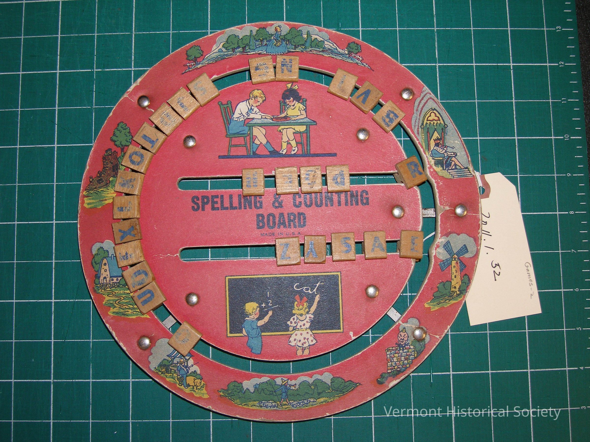 Spelling and counting board consisting of a cardboard disk with wooden tiles fitted into tracks. Each tile is printed with a letter on one side and a number or math equation symbol on the other side. There are 2 horizontal tracks in the middle of the board connected on the right to a circular track around the edge. The front and back of the board are printed in the center with images of 2 children playing with the board at a table [top] and writing on a chalkboard [bottom]. The edge of both sides is printed with illustrations of scenes from children's fairytales. The ground is printed red. The board is held together by metal bars riveted to either side of the outer track, allowing the track to be continuous.Use