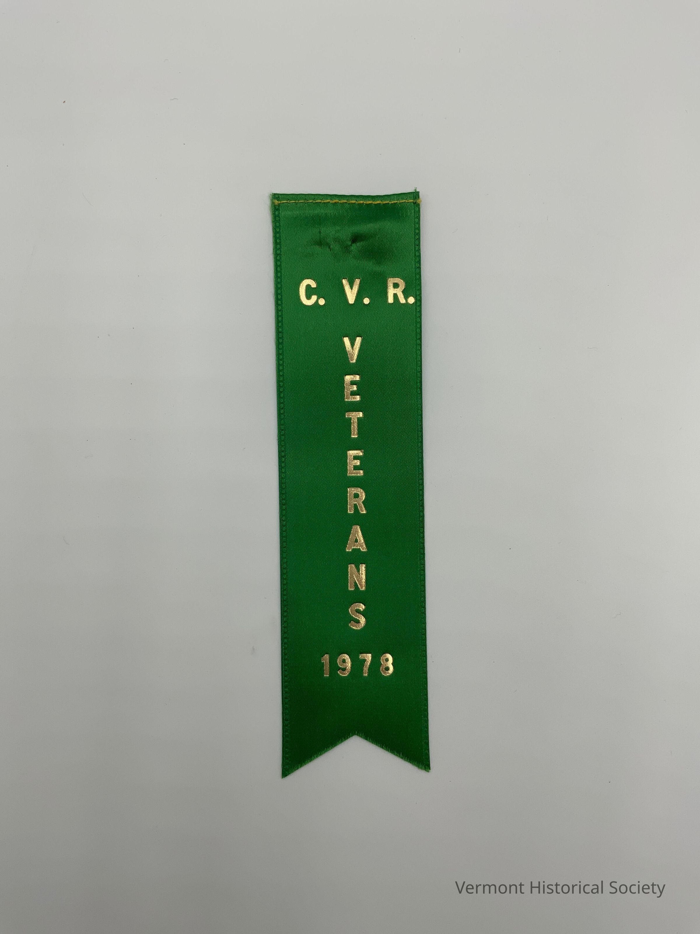 Green satin-woven ribbon with the stamped inscription, "C. V. R. VETERANS 1978". The bottom is cut into two points, and there is a safety pin attached to the top back.