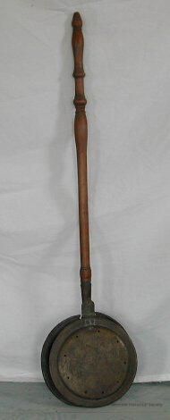 Bed warmer consisting of a round pan and long wooden handle. The pan has an attached lid that hinges open at the handle. The lid is pierced with circles around the edge.