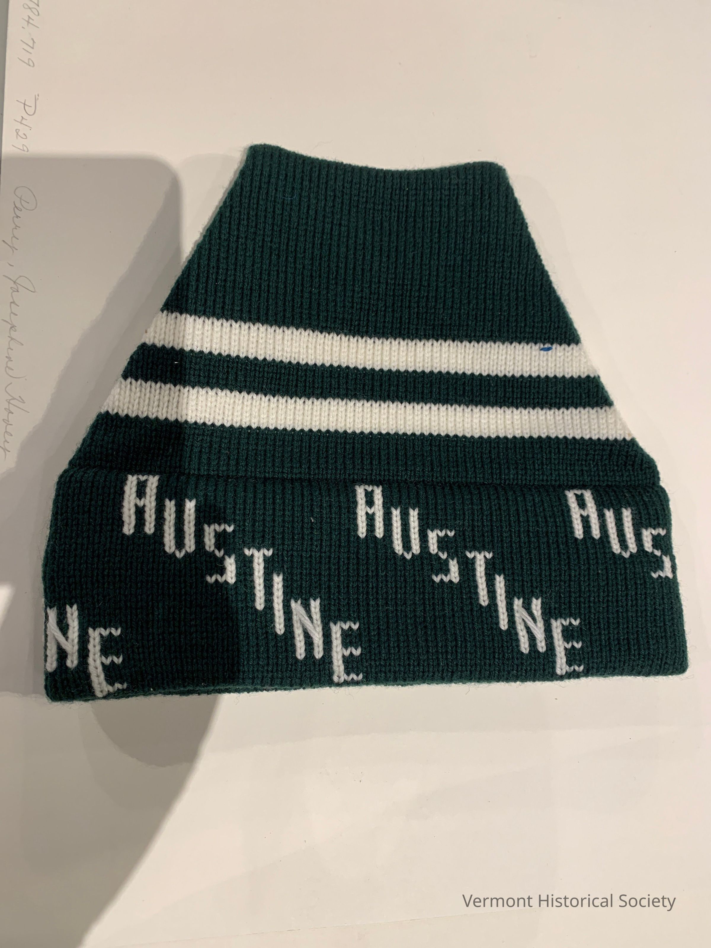 Hat appears machine-knitted but all decorations, of "AUSTINE" spelled in descending letters is part of the knitted fabric and therefore highly specialized in this case. Wintry-ski type hat with thicker material and flexible shape.Lexicon