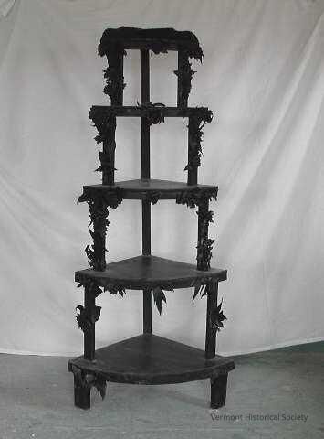 5-shelf wooden whatnot decorated with leather grapes, leaves & flowers. Painted black. Shelves graduated in size.