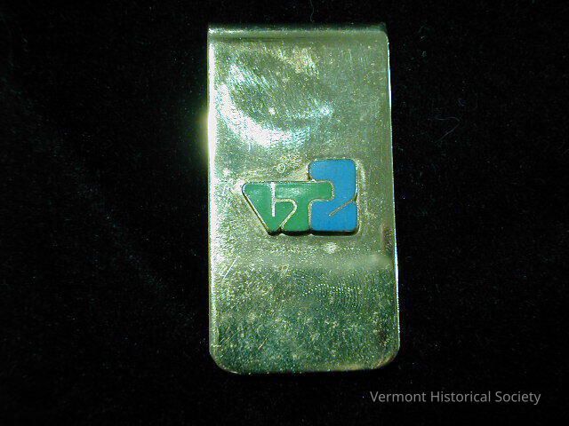 Gold-toned metal money clip with the logo for Vermont's celebration of the United States Bicentennial at the center. The logo consists of the letters VT in green and the number 2 in blue formed around the T.Context