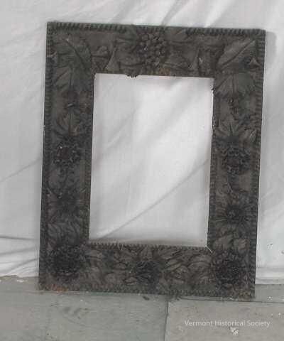 Rectangular wooden frame decorated with leather flowers, leaves, and grapes. The entirety is painted black.