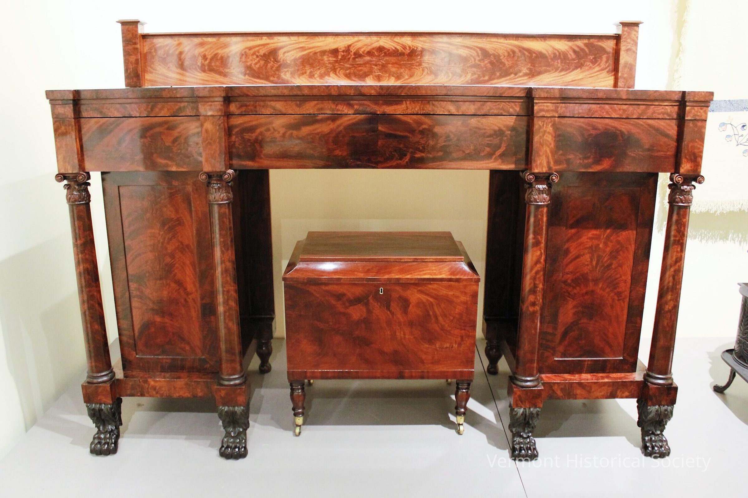 Middlebury was a bustling and thriving town when Seymour purchased this furniture. There were several cabinetmakers capable of making stylish pieces that these, but at this point we don't know which one produced these two. The sideboard was used to hold serving pieces, linens, and silverware. The cellaret, a rare furniture form in Vermont, has square wooden compartments inside for holding bottles of wine and liquor.