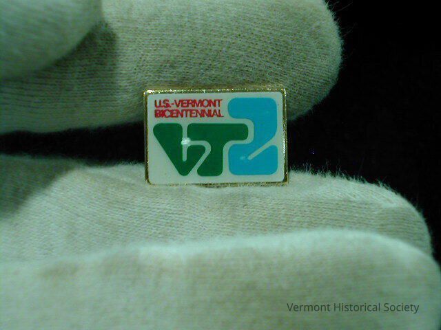 Rectangular lapel pin with white enamel. Across the front is the Vermont logo for the US Bicentennial: "VT2" in stylized bubble letters with the VT in green and the 2 in light blue and curving around the T. Above the logo is the red inscription, "U.S.-VERMONT BICENTENNIAL".