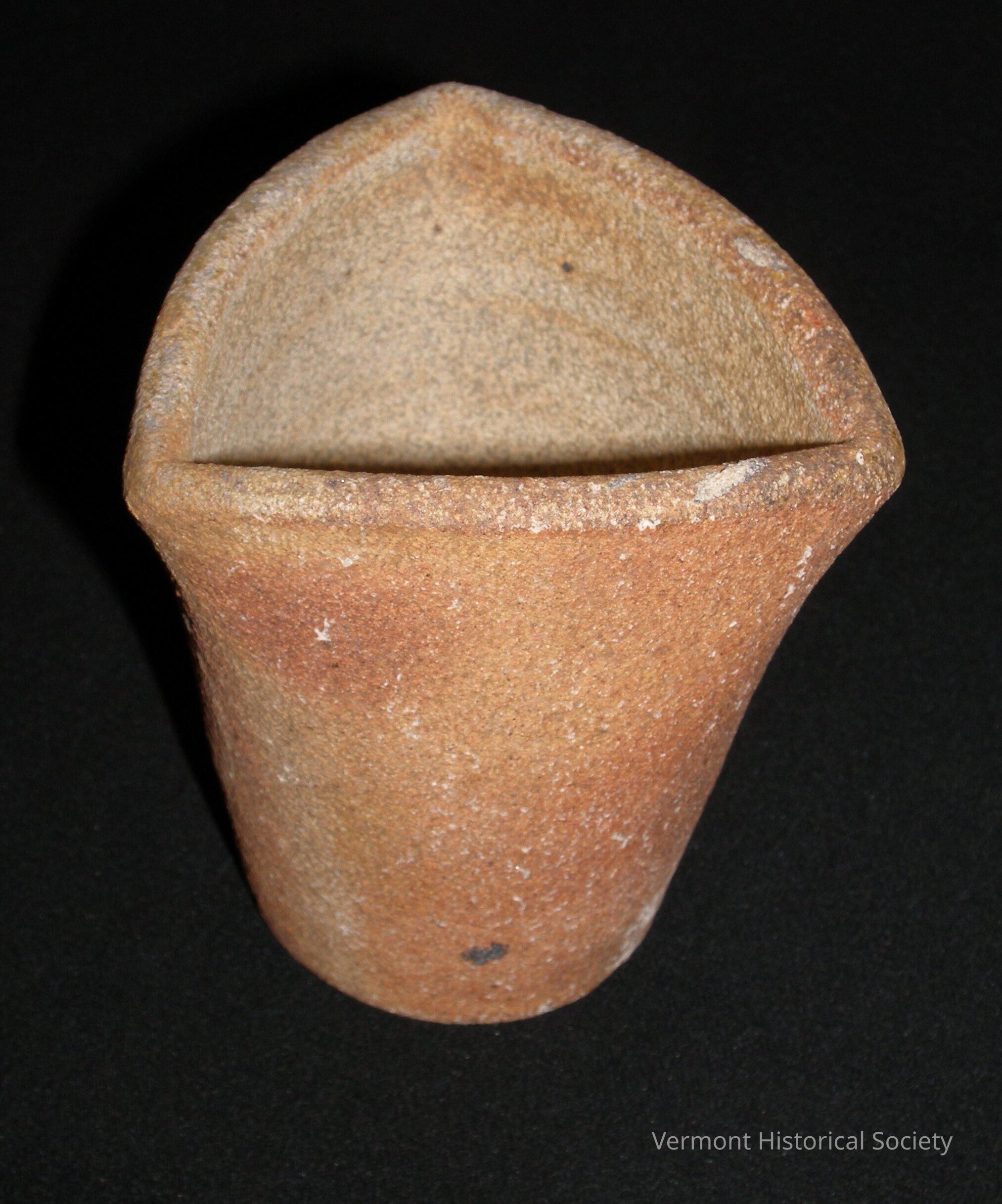 Triangular fire assay crucible. The crucible is round at the base, but flare outward to three points at the top, creating spouts for pouring. There is a partial maker's mark reading "[illeg]EL & SOHN".Use
