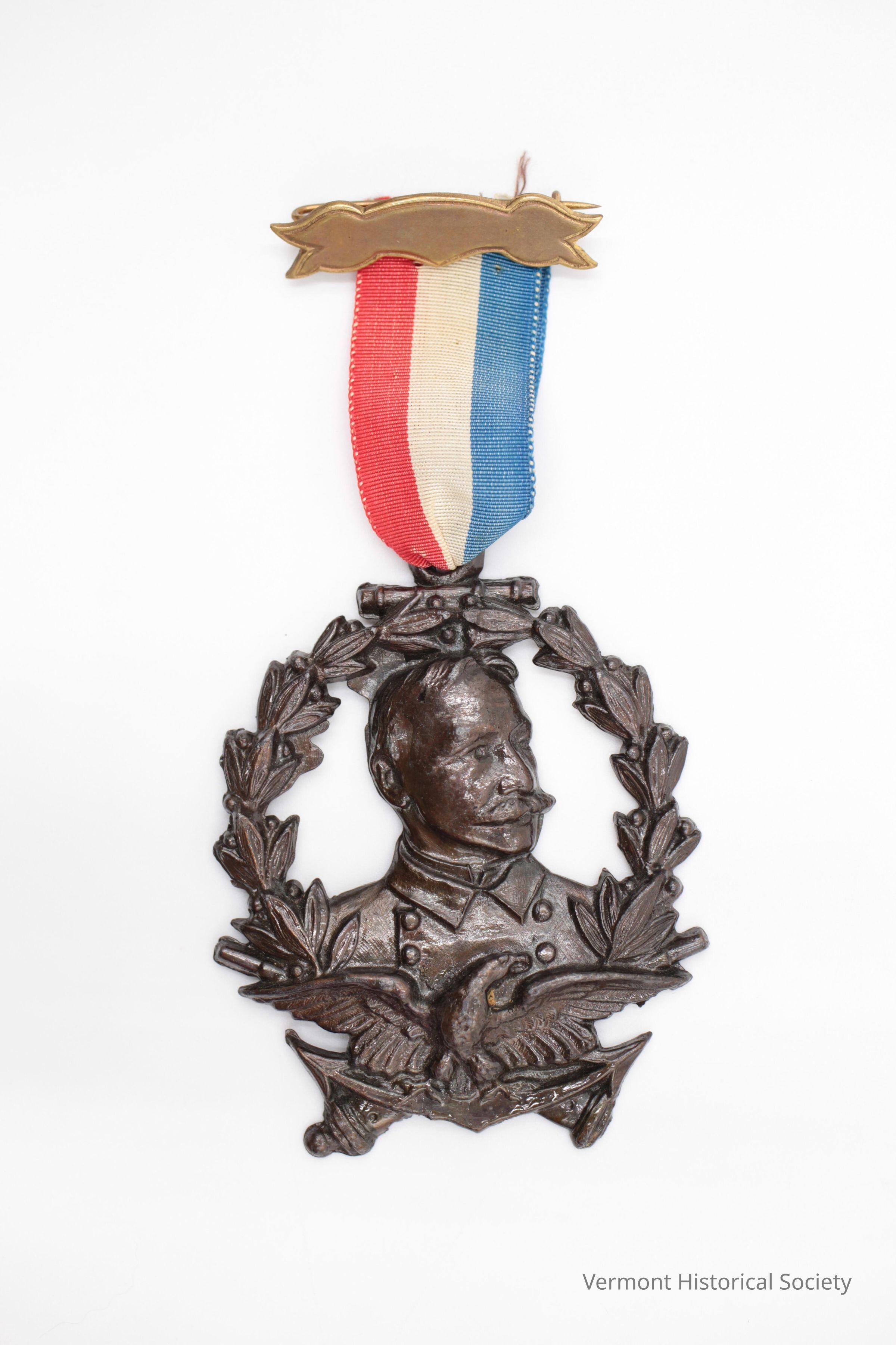 Large commemorative metal consisting of a bar, a ribbon, and a medallion. The bar is shaped like a banner and left unengraved. The grosgrain ribbon is striped red, white, and blue. The medallion is in the shape of a bust of Admiral Dewey within a laurel wreath with a spread eagle at the bottom.Context