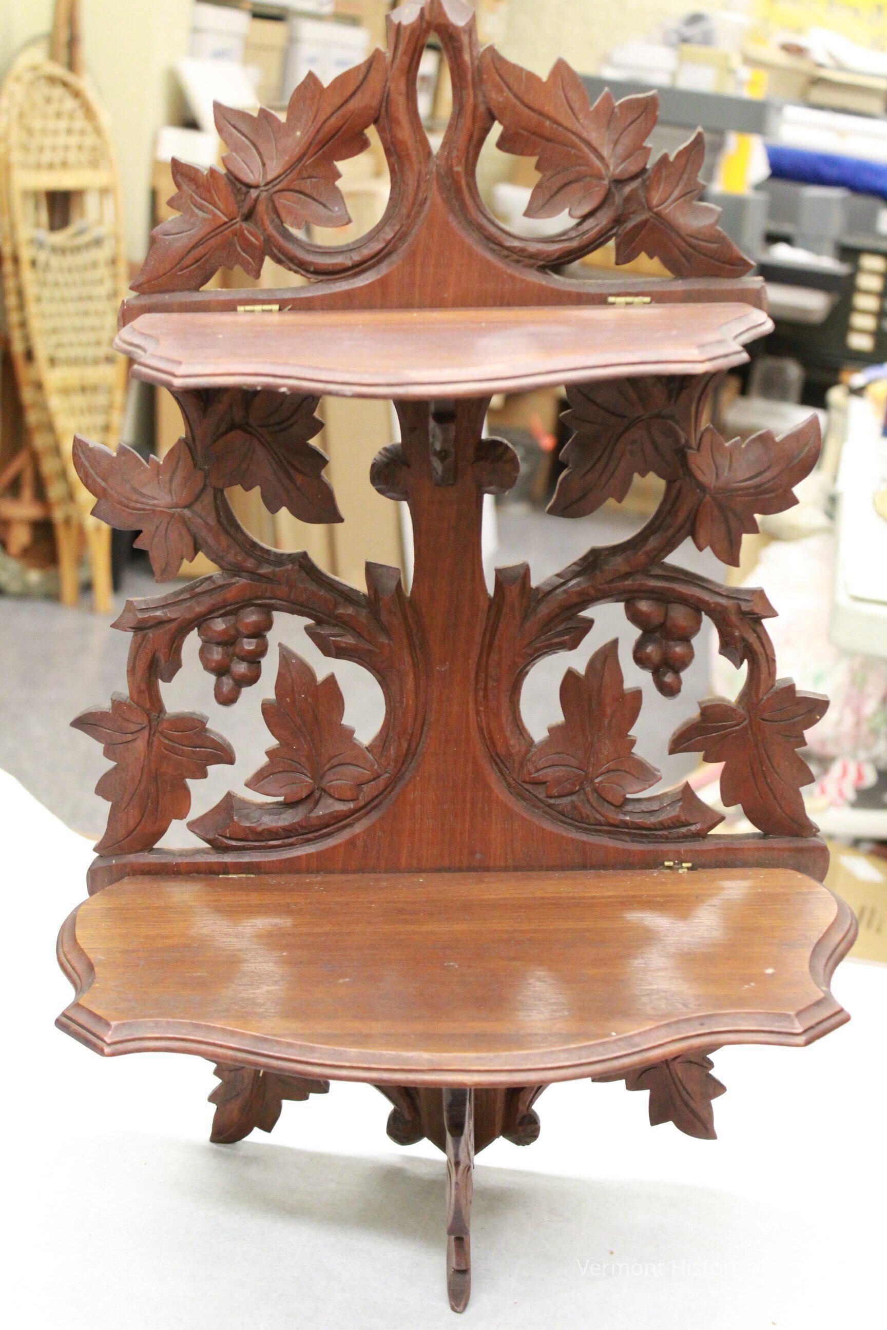 Hanging shelf with 2 shelves. The backboard is carved into grape vines with grapes and leaves. The shelves are hinged to fold flat.