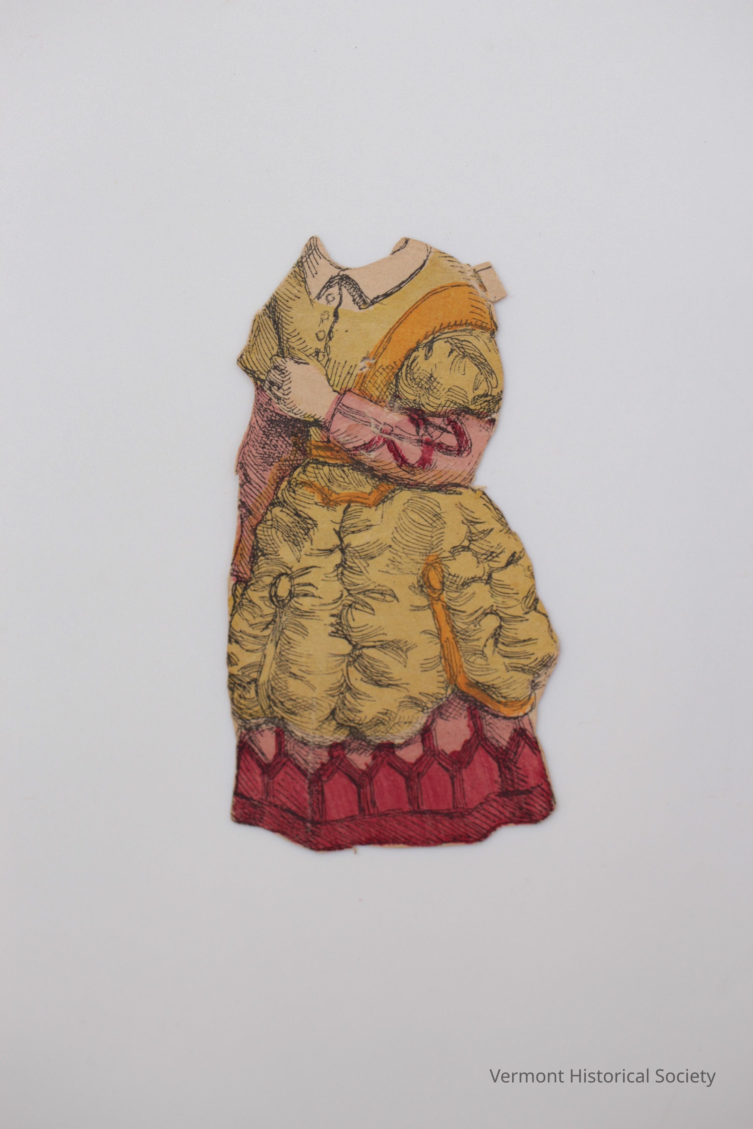 Paper doll dress. The dress has pinks sleeves and petticoat and a yellow overdress. It has a white collar.