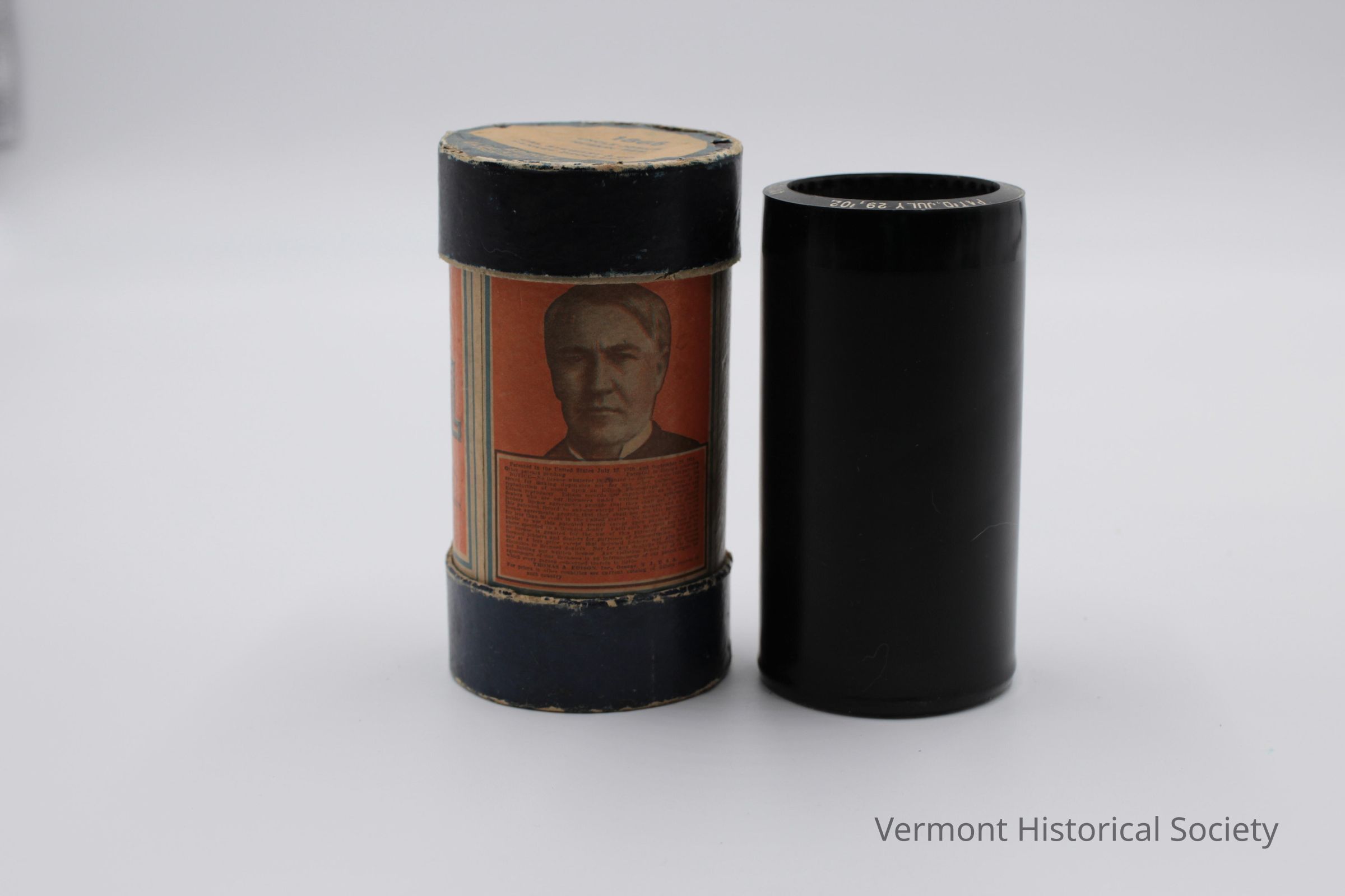 Black phonograph cylinder with a cardboard case. The cylinder, or "record", is a hollow cylinder consisting of hard, blue, ridged celluloid around a concrete core. One edge of the cylinder is labeled in white with the words, "1896 4 M. 3195. QUARTETTE. THE OLD OAKEN BUCKET. / Thomas A Edison PAT'D. 24."Use