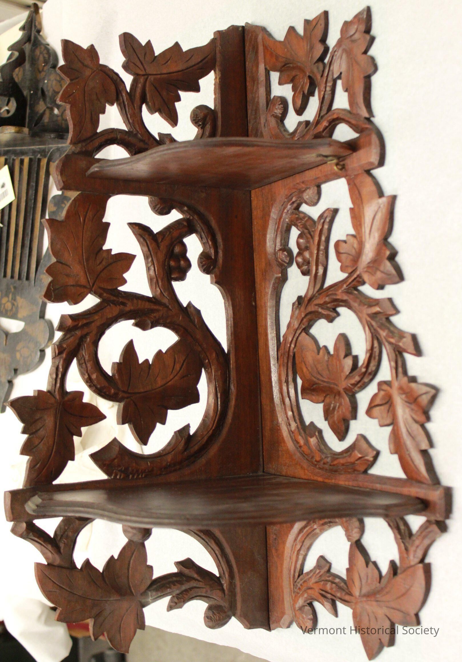 Hanging corner shelf with 2 shelves. The frame is carved into grape vines with grapes and leaves. The shelves are hinged on the proper left to fold flat.