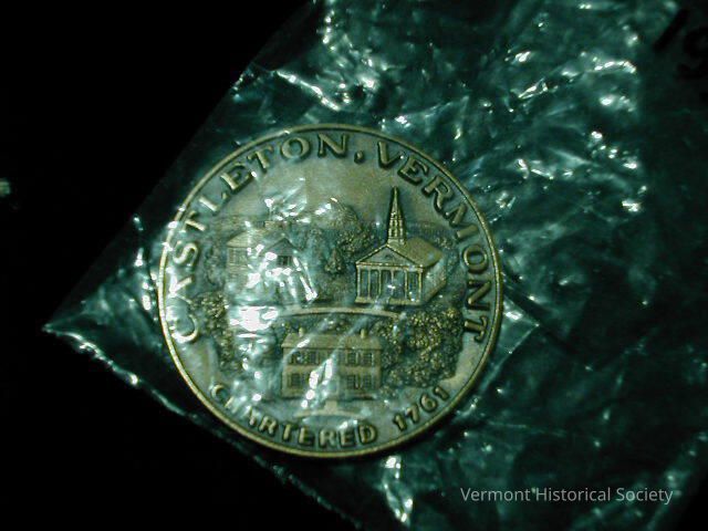 Bronze commemorative medal or token. One side shows a group of buildings, including houses and a church, amid trees with the inscription "CASTLETON, VERMONT / CHARTERED 1761". The other side shows a building with the inscription, "AMERICAN REVOLUTION BICENTENNIAL 1776 - 1976" around the edge and "OLD COBBLERS SHOP" at the bottom.Context