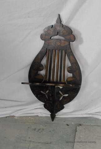 Decorative wooden display shelf carved in the shape of a lyre. It is stenciled with a floral design.Context