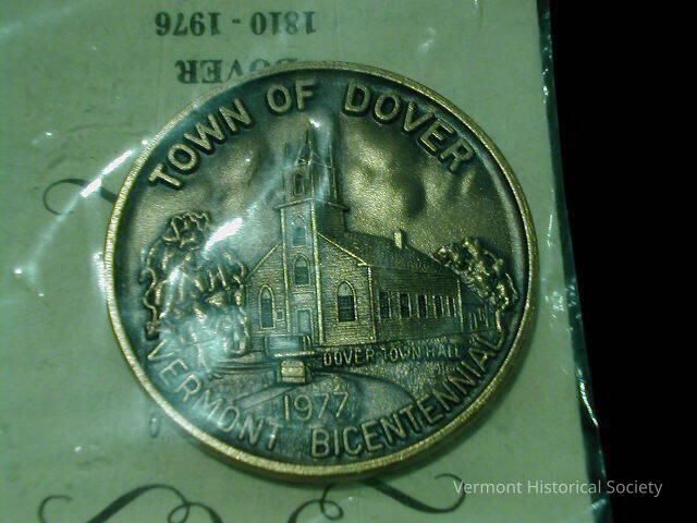 Bronze commemorative medal showing a building with arched windows and a square cupola at the center front. The inscription, "TOWN OF DOVER / 1977 / VERMONT BICENTENNIAL" rings the edge, and the the building is labeled, "DOVER TOWN HALL". The other side is molded with a flying eagle holding a ribbon that says, "EQUALITY JUSTICE LIBERTY", with the inscription, "AMERICAN REVOLUTION BICENTENNIAL 1776-1976" in the background.Context