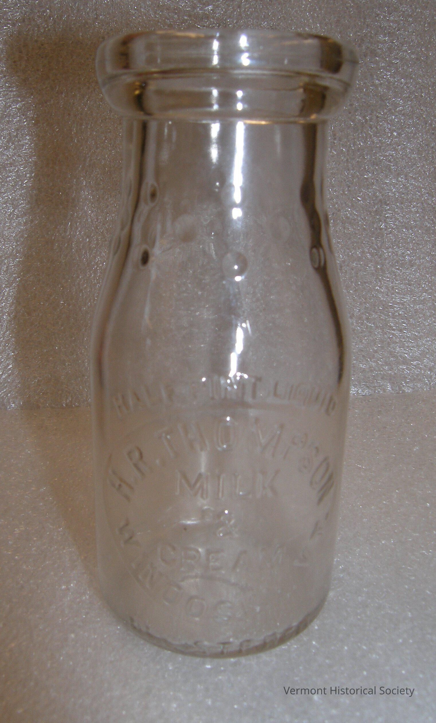 Glass cream bottle. Raised lettering reads "HALF PINT LIQUID / H.R. THOMPSON / MILK / & / CREAM / WINOOSKI, VT." on the front of the bottle, "REGISTERED" along bottom in front, and "SEALED B BX" along the bottom in the back. Three alternating rows of small raised dots decorate the neck of bottle.