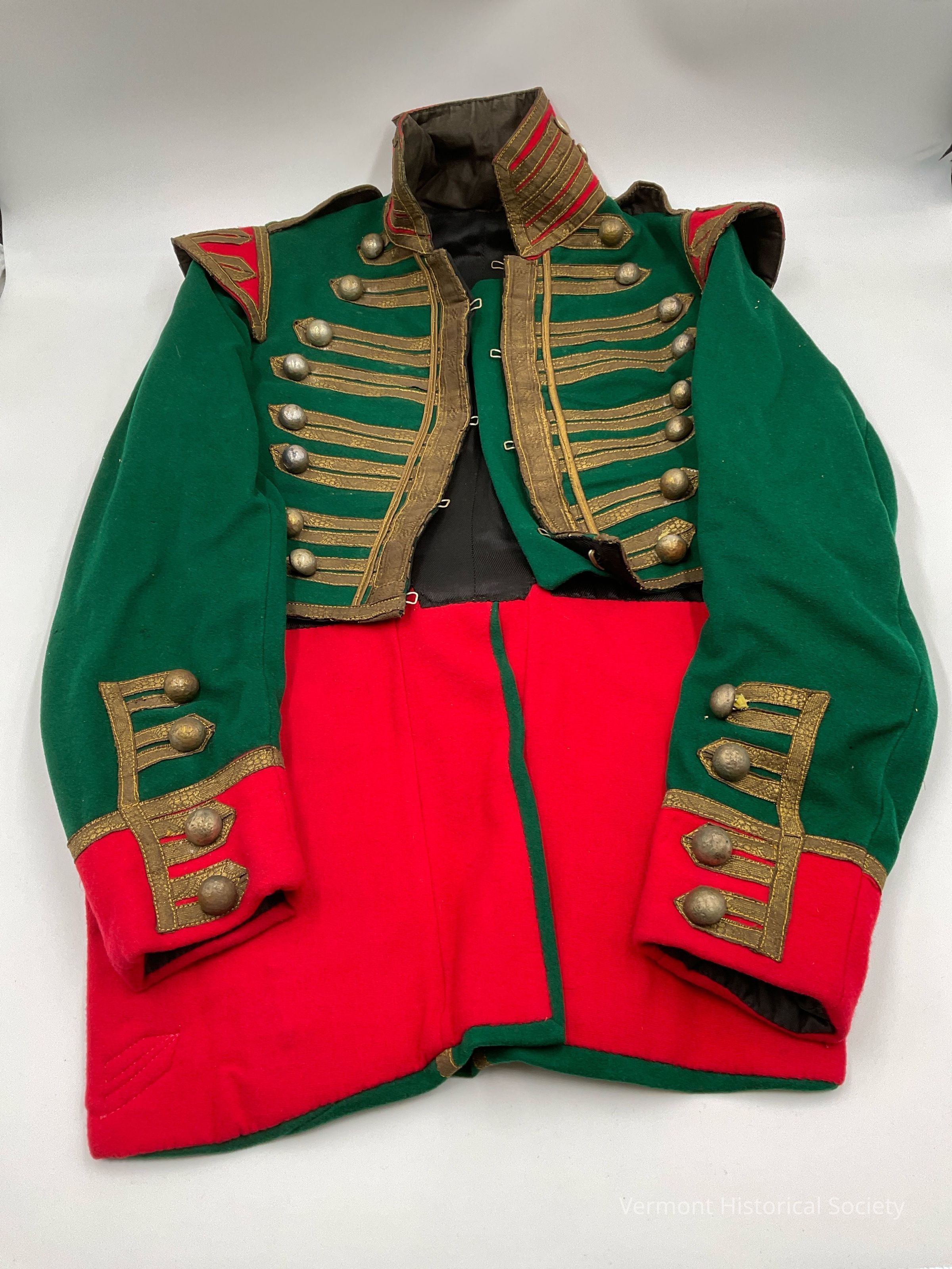 Bright green, red and gold jacket with sixteen buttons on the chest and four on each sleeve. The jacket has a short front and tails in the back.Context