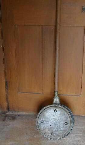 Bed warmer consisting of a round pan and long wooden handle. The pan has an attached lid that hinges open at the handle. The lid is pierced with circles in a pattern of four daisies.