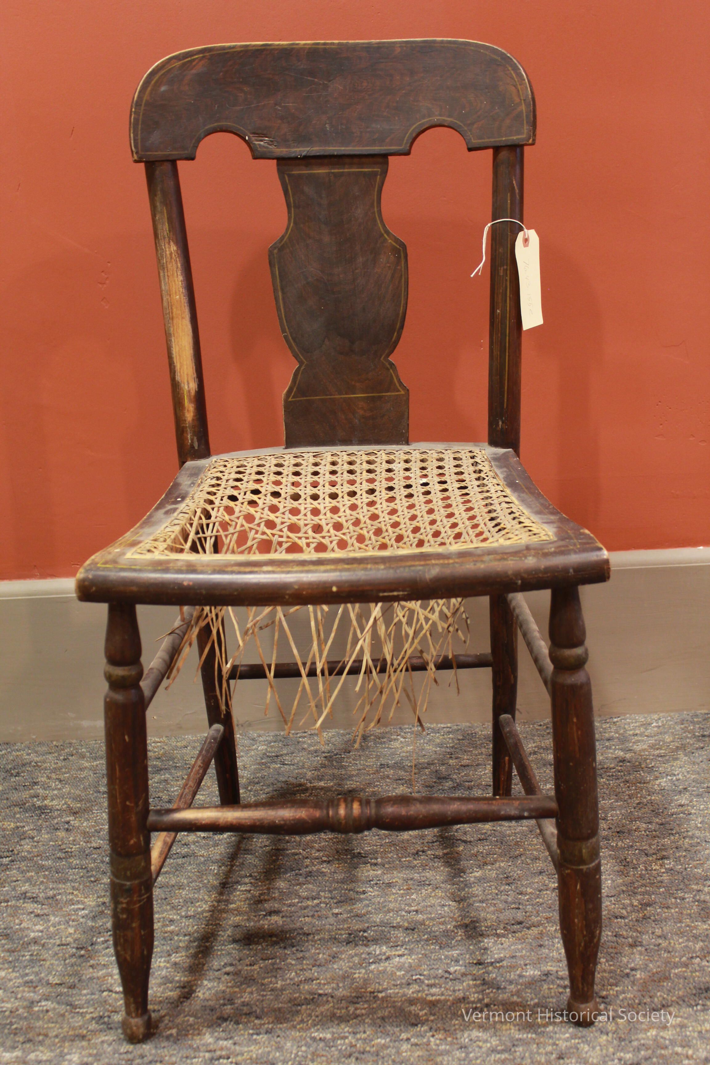 Splat-backed side chair with caned seat. The chair is grain painted with yellow outlines imitating inlay. The splat is vase shaped.